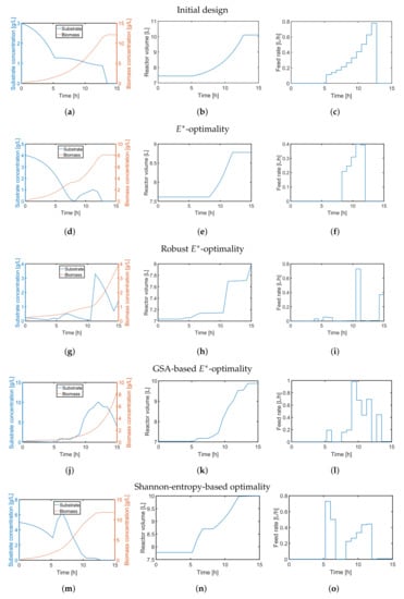 Similar to the -design, the derived initial substrate concentration is high; see Figure 8m. For the feeding rate, there are two distinct feeding periods as illustrated in Figure 8o. The resulting parameter estimates, which are summarized in Figure 9m–o, show no significant improvement in the parameter estimates in comparison to the unoptimized initial experimental setting or the -design. The main reason here is the tedious tuning of the multi-objective function, i.e., providing an optimal weighting vector w. For instance, when using in the Shannon 2 study, the quality of the parameter estimates improves significantly as illustrated in Figure 10. In comparison to the previous MB-OED results, the Shannon-entropy-based design in combination with a proper weight vector w leads to improved parameter estimates, i.e., lower parameter variations and correlations as shown in Figure 10d–f. A low initial substrate concentration (Figure 10a) followed by a gradual increase in the feeding rate (Figure 10c) provide very informative data and precise parameter estimates, respectively. This conclusion can be validated by analyzing Figure 11. The relative parameter errors clearly indicate the second Shannon-entropy-based design as the most suitable one for the parameter identification problem. Please note parameters were sampled from their assumed uniform density functions.