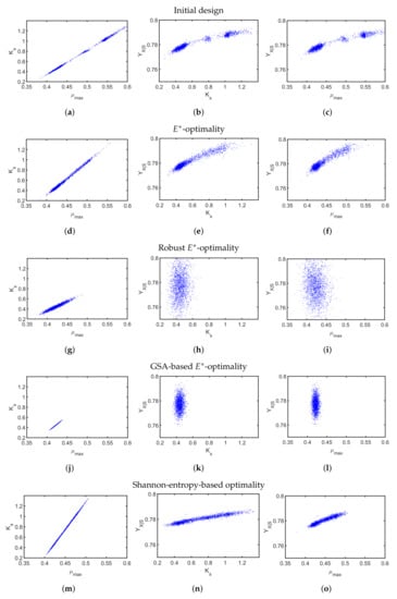 Performance of the experiments from initial design (a–c), -optimality (d–f), robust -optimality (g–i), GSA-based -optimality (j–l), and Shannon-entropy-based design (m–o), where scatter plots are used to present the confidence region for the estimated parameters, which result from 2000 MC simulations.