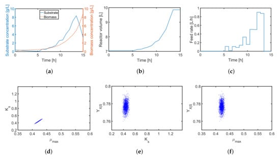 Evolution profiles for three states ((a) biomass concentration, substrate concentration; and (b) volume of the reactor) and (c) the feed rate for the adapted Shannon-entropy-based design with . In (d–f), the resulting parameter estimates are shown.