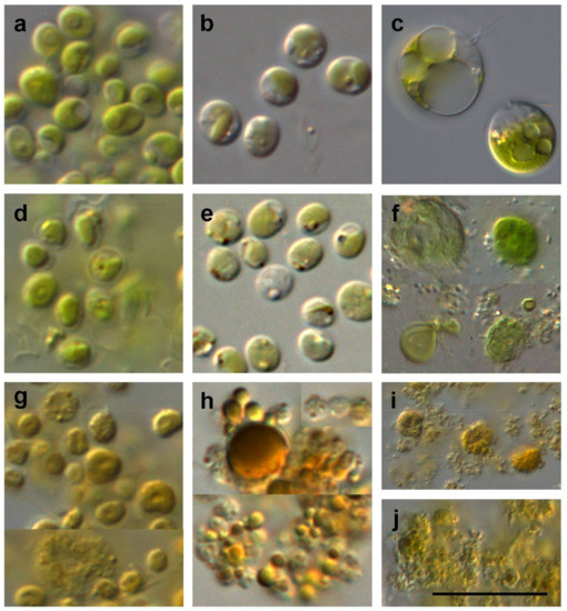 Light micrographs of Chlorella sorokiniana (a,d,g), Nannochloropsis gaditana (b,e,h), and Dunaliella tertiolecta (c,f,i,j) before and after steam explosion. (a,b,c) Live cells; (d,e) Thawed material; (f) D. tertiolecta after centrifugation; (g,h,i) Algal material after steam explosion with acid; (j) D. tertiolecta after steam explosion without acid. Scale bar corresponds to 10 µm in (a–f) and to 20 µm in (g–j).