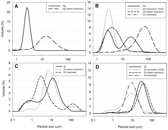 The examination of cell morphology by light microscopy showed that C. sorokiniana, N. gaditana, and D. tertiolecta had experienced high levels of cell disruption after the steam explosion pretreatment (Figure 1). Original samples consisted of isolated cells, except for C. sorokiniana, which contained both single cells and cell aggregates, hence the bimodal distribution in Figure 2B. Sonication dispersed cells and most aggregates were disintegrated. Accordingly, after sonication, the peak centered in ca. 3 µm, matching the C. sorokiniana cell size, was much higher, and the peak centered at ca. 20 µm which corresponds to aggregates almost disappeared.