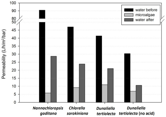 In terms of pretreated microalgae filtration, the N. gaditana sample resulted in a microalgae permeability of 5.84 L/h/m2/bar, the lowest value among the samples. With D. tertiolecta exploded without acid, a microalgae permeability of 6.93 L/h/m2/bar was obtained, and with C. sorokiniana, a permeability of 9.18 L/h/m2/bar was reached. The best membrane performance was obtained when filtrating the sample of D. tertiolecta exploded with acid, with the permeability value of 10.97 L/h/m2/bar.