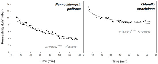 Permeability profiles vs. time of filtration experiments performed with (a) Nannochloropsis gaditana and (b) Chlorella sorokiniana.