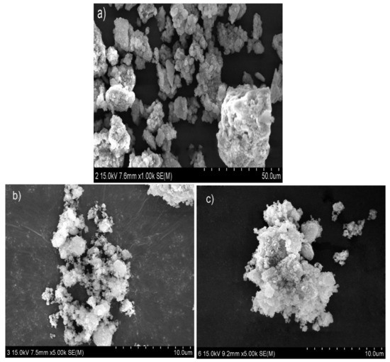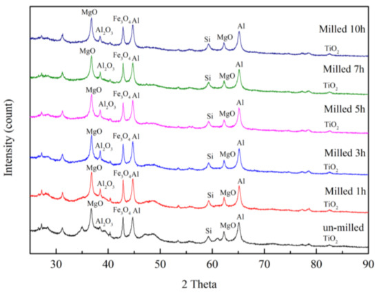 The SEM micrographs of as-received and mechanically activated black dross are shown in Figure 2. The black dross initially contained angular particles with different sizes and were broken into much smaller particles after mechanical activation. Large clusters with a typical size of several micrometers were observed due to the aggregation of smaller nanoparticles [19].