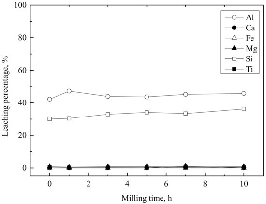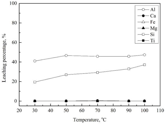 In order to investigate the effect of temperature on the dissolution of oxides in dross, the dross mechanically activated at 400 rpm for 1 h was leached by varying temperature from 30 to 100 °C for 2 h. In these experiments, a 5 M NaOH solution was used, and the pulp density was kept at 20 g/L. The leaching percentage of alumina and silica increased from 40 and 19% to 47 and 37%, respectively, as temperature increased from 30 to 100 °C, while that of other oxides was negligible (see Figure 7). The enhancement in leaching percentage of alumina and silica at high temperatures is related to the increase in the energy available for atomic and molecular collisions, which accelerate the interaction between hydroxyl ions with alumina and silica [26].