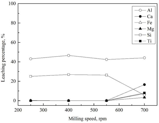 In order to investigate the effect of milling speed on the leaching behavior of the dross, the dross was mechanically activated by varying milling speed from 250 to 700 rpm. These mechanically activated dross was leached using a 5 M NaOH solution at a pulp density of 20 g/L, 50 °C for 2 h. The leaching percentage of alumina and silica was about 45 and 25%, respectively, in the milling speed range of 250–500 rpm, while other oxides were not dissolved (see Figure 4). As milling speed increased from 550 to 700 rpm, a remarkable change in the leaching behavior of the oxides, except alumina, was observed. The leaching percentage of silica decreased from 25 to 5% with an increase in milling speed from 550 to 700 rpm, while that of Ca, Fe, Mg, and Ti oxides was slightly increased.