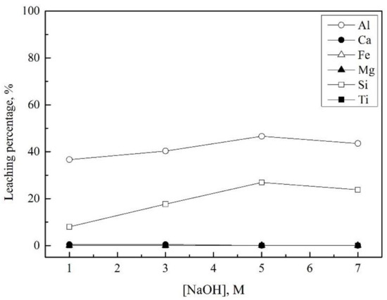 Thus, the leaching percentage of alumina and silica slightly decreased when NaOH concentration was in 5–7 M. Since the highest leaching percentage of alumina was obtained at 5 M NaOH, further leaching experiments were conducted using a 5 M NaOH solution.