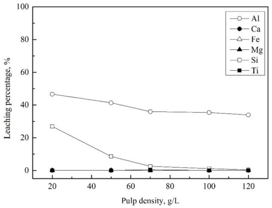 In the leaching process, pulp density generally affects productivity. Therefore, the effect of pulp density on the leaching behavior of the dross mechanically activated at 400 rpm for 1 h was investigated by varying pulp density from 20 to 120 g/L. In these experiments, the mechanically activated dross was leached using a 5 M NaOH solution with a reaction time of 2 h at 50 °C. As the pulp density increased from 20 to 120 g/L, the leaching percentage of alumina slightly decreased (see Figure 8). The leaching percentage of silica decreased rapidly with the increase in pulp density, and no silica was dissolved when pulp density was higher than 100 g/L. Moreover, the oxides of Ca, Mg, Fe, and Ti were not dissolved in the whole range, so pure alumina solution was obtained by adjusting the pulp density.