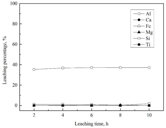 The effect of leaching time was investigated using a 5 M NaOH at a pulp density of 100 g/L and 50 °C. In these experiments, the dross mechanically activated at 400 rpm for 1 h was leached by varying leaching time from 2 to 10 h. Within our experimental range, the leaching time did not show any effect on the leaching behavior of the oxides in the mechanically activated dross (see Figure 9). The leaching percentage of alumina was about 35%, while that of other oxides was nearly zero at any leaching time. The purity of Al in the leaching solution was 98.8% at the leaching time of 2 h. The composition of the leaching solution and purity of Al in the solution after NaOH leaching is shown in Table 3.