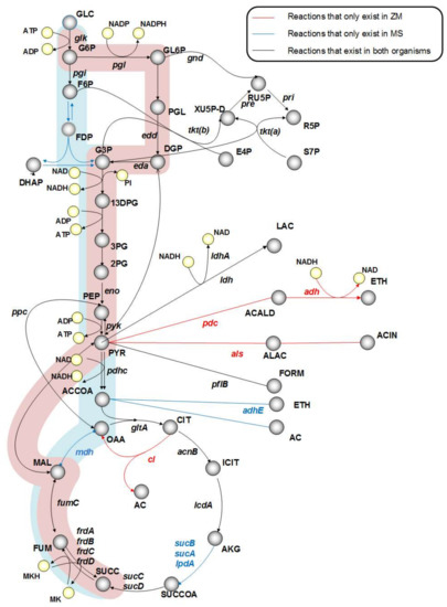 Comparison of central metabolism in Zymomonas mobilis and Mannheimia succiniciproducens. Blue and red shadows highlight the succinic acid production pathway in M. succinicproducens and Z. mobilis, respectively.