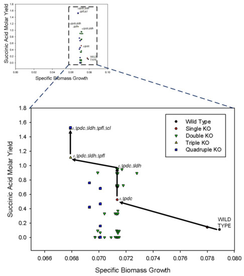 Simulation results for gene knockout analysis on central metabolic pathways. The shift in biomass growth and succinic acid molar yield from wild type to quadruple knockout (KO) is shown. The best strain for SA production is also shown for single (iΔpdc), double (iΔpdcΔldh), triple (iΔpdcΔldhΔpfl), and quadruple (iΔpdcΔldhΔpflΔcl) knockouts.