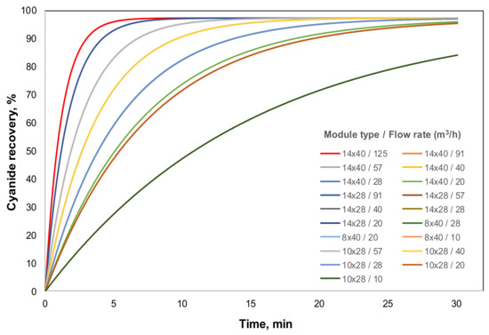 A phenomenological model has been developed in this work to predict the performance of the industrial membrane Liqui-CelTM modules in a GFMA process for cyanide recovery in a batch arrangement. This process configuration considers that the cyanide solution is fed into a membrane module and the treated solution is recirculated into the feed tank up to a complete 30 min of recirculation. Different cyanide feed-flow rates were carried out for each membrane module in order to determine the optimum capacity in each module. According to the Liqui-CelTM specifications, the capacity ranges for each membrane module are 16–125 m3/h, 16–91 m3/h, 7–28 m3/h, and 10–57 m3/h for 14 × 40, 14 × 28, 8 × 40, and 10 × 28 modules, respectively. Based on this information, the feed-flow rates tested in the phenomenological model ranged between 10 m3/h and 125 m3/h. Figure 6 presents the results of these simulations, where similar kinetics of cyanide recovery were obtained for each membrane module at the same feed-flow rate, overlapping some curves. This fact is explained by a compensation effect of K × A value; while K decreases when the capacity is decreasing, the area remains higher for the larger modules. This explains the presence of 8 curves in Figure 6 for 19 different simulated conditions.