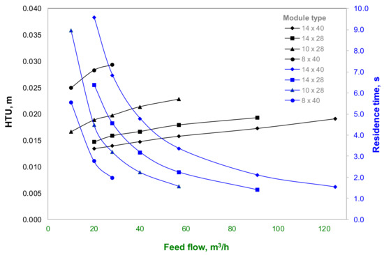 The HTU value is the main parameter for evaluating the performance of mass-transfer equipment, since this parameter depends on equipment dimensions and hydrodynamic characteristics; instead, the NTU value is defined by the operational conditions of the process. This supports the criterion for scaling-up based on ensuring the performance at different scales, where the HTU parameter should be the variable to keep it fixed at the maximum capacity of a membrane contactor module. This design criterion would allow the cyanide-recovery (process performance) expected for the maximum capacity of the different membrane modules to be ensured. Figure 7 shows the results of HTU values for the industrial Extra-Flow modules assessed as a function of the feed-flow rate. Here, the 14 × 40 Extra-Flow module presents the lowest HTU values and the HTU value at maximum capacity for each membrane module is different, so that it supports the earlier explanation of cyanide-recovery results from Figure 6. Hence, for a high requirement of cyanide solution treatment, the best performance represented by the highest cyanide recovery with minimum contact surface area could be achieved with the 14 × 40 Extra-Flow module at 125 m3/h. Nevertheless, when the required treatment capacity is lower and a membrane module with less capacity is selected for economic reasons, the kinetics of cyanide transfer will be slower, increasing the required contact surface area for mass transfer. Likewise, the same cyanide-recovery values having different HTU values for each membrane module are explained by different NTU values, i.e., when the HTU value increases, the NTU value decreases. This is promoted by the residence time reached for each membrane module at different feed-flow rates. Figure 7 shows the residence time values for each membrane module where the smallest modules present lower residence-time values with respect to the bigger ones. This fact promotes a decrease of cyanide transfer, yet the mass-transfer coefficient is higher in these modules with respect to the larger ones. Thus, the main issue of scaling-up a membrane module based on the flow rate capacity is the increase of surface area available for mass transfer, which should increase with additional membrane modules to reach a cyanide recovery higher than 90%, particularly for a plant with capacities below 57 m3/h.