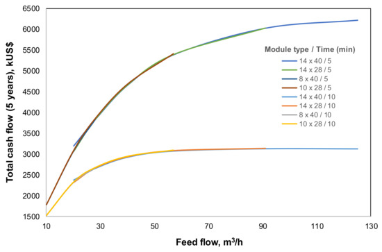 The energy losses promoted by the pressure drop in the membrane modules are the main cost intrinsically associated with a membrane contactor, and is related to the investment cost for each module. For the cyanide-recovery process, the acid consumption has to be considered in an economic evaluation; however, this cost is constant for each case because the initial mass of cyanide to be extracted is the same and equal to 3000 kg. Therefore, it has not been considered in this evaluation. Figure 8 presents the results of total cash flow for a 5-year time period, considering the cyanide recovery reached at 5 min and 10 min for each feed-flow rate and for each membrane module. These results show a minimum effect of pressure drop in the membrane module selection, due to the high cyanide-recovery value. In fact, the expected curve for each case should have a parabolic behavior, since the energy consumption increases when feed-flow rate does as well. However, in this case the increase in energy consumption is not enough to decrease the estimated cash flow. Furthermore, these results show a continuous behavior of each curve from each membrane module, generating a single cash flow curve for 5 min and 10 min. This result can be explained by the results of cyanide recovery reported in Figure 6 where the cyanide recovery determines the incomes, and is equal for each module at the same feed-flow rate of the treated solution. Moreover, the low impact of energy consumption does not allow a clear difference between the curves of cash flow for each module to be observed. The optimal operation for each module will, thus, always be observed at maximum flow rate, as explained by the increase of the mass-transfer coefficient, and consequently, by the cyanide recovery. Likewise, there is no difference in economic terms related to the selection of the best membrane module at a specific feed-flow rate of treated solution. These results could change for another element with a lower sale price, although this methodology should be performed to select the optimum feed-flow rate and membrane module. In this framework, the pressure drop information reported in Figure 4 is useful to predict the most efficient module in terms of energy, where the 14 × 40 HFMC shows the lowest curve of pressure drop.