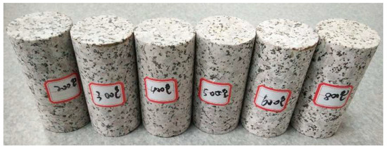Then, by using a high-temperature furnace, the granite samples were exposed to high temperatures (200, 300, 400, 500, 600, and 800 °C). The heating rate was 10 °C/min until the set temperature level, and this temperature was maintained for 2 h to ensure that the samples heated evenly. When considering the heating rate of 10 °C/min, we assume that the heat travels fast in solids [20]. Finally, the samples were naturally cooled to room temperature. The samples after high-temperature exposure are shown in Figure 1.