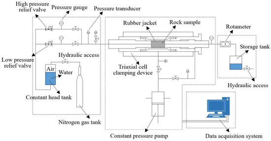 The granite samples after high-temperature exposure were used to conduct fluid flow tests at room temperature using the LDY-50 permeability testing system (Haian county petroleum research instrument co. LTD, Nantong, China) (Figure 2). The maximum confining pressure of the system is 50 MPa. The system consists mainly of the following four units: (1) a water supplying system; (2) a triaxial cell clamping device; (3) a speed constant pressure pump; and, (4) a water measurement and collection system. Before testing, the samples were enclosed by a 3-mm-thick rubber jacket. Then, the samples were inserted into the triaxial cell clamping device with two porous stone platens over the ends to ensure an even distribution of the water pressure. Then, the water was fed using a fluid pump to the left side of the rock sample, flowed to the right side, and finally exited via a stainless steel tube.