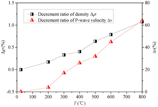 Figure 3 presents the variations in density and P-wave velocity for the granite samples after high-temperature exposure, in which Δρ and Δv denote the decrement ratios of the density and P-wave velocity, respectively, and can be calculated, as follows: