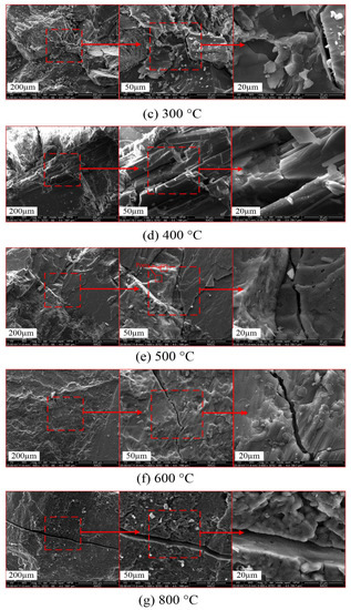Scanning electron microscope (SEM) images of granites at room-temperature and after high-temperature exposure. (a) Room temperature; (b) 200 °C; (c) 300 °C; (d) 400 °; (e) 500 °C; (f) 600 °C; (g) 800 °C.