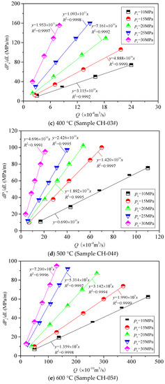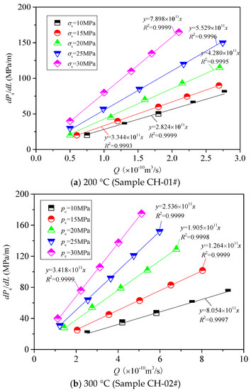 For all of the test cases, as the pressure gradient dPs/dL increases, the volume flow rate Q flowing out of the sample shows an increasing trend. The relations between dPs/dL and Q can be well described using a zero-intercept linear function, and are shown by the solid lines in Figure 6, in which L denotes the length of the sample. From Figure 6, the correlation coefficients or the R2 values are all larger than 0.99, indicating that the linear Darcy’s law fits the raw experimental data very well, and that the fluid flow is laminar. In addition, the increase in pc does not change the linearity of the fluid flow through the samples, but the slopes of the dPs/dL-Q fitting curves become steeper with the increase in pc due to the closure of defects, indicating a higher flow resistance. However, for a given pc, the slopes of the fitting curves show decreases with increases in T.