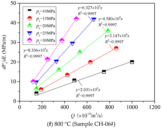 Volume flow rate Q as a function of pressure gradient dPs/dL of the granite samples after high-temperature exposure. (a) 200 °C (Sample CH-01#); (b) 300 °C (Sample CH-02#); (c) 400 °C (Sample CH-03#); (d) 500 °C (Sample CH-04#); (e) 600 °C (Sample CH-05#); (f) 800 °C (Sample CH-06#).
