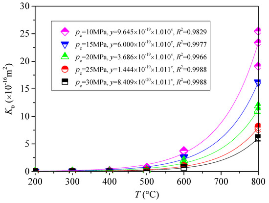 In the range of 400–800 °C, K0 increases sharply. For T = 800 °C, the K0 values for the samples are 2.34 × 10−15 (pc = 10 MPa), 1.62 × 10−15 (pc = 15 MPa), 1.13 × 10−15 (pc = 20 MPa), 7.99 × 10−16 (pc = 25 MPa), and 6.08 × 10−16 m2 (pc = 30 MPa), increasing by factors of 148.82, 156.37, 163.90, 171.82, and 234.36, respectively, over the values for T = 400 °C. The main reasons for the variations are as follows. At temperatures between 400 °C and 800 °C, thermal expansion and ion transformation occur in the granites. The samples undergo irreversible thermal damage. The interior cracks of the rocks extend quickly, and the porosity increases, resulting in a sharp increase in the conductivity.