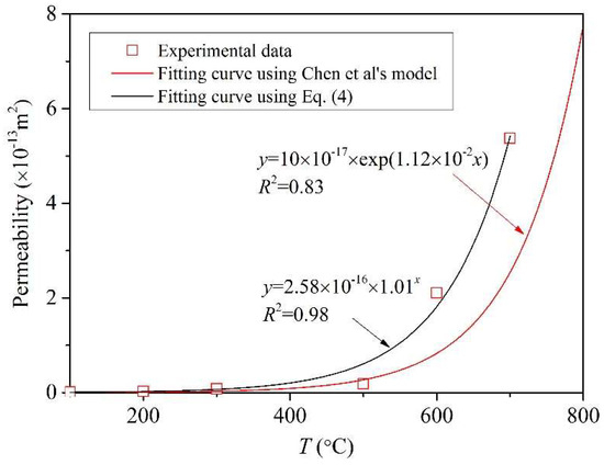 Chen et al. [18] studied the evolution of thermal damage and the permeability of the Beishan granite, and found that the permeability of granite samples after different temperature treatments and under a hydrostatic pressure of 5 MPa can be described using an exponential function (Figure 8). Generally, the evolution characteristics of permeability are consistent with the experimental results that are obtained here in this study. Then, the permeability in Chen et al.’s study as a function of temperature was evaluated using Equation (4). The comparison results are displayed in Figure 8. It shows that the fitting quality using Equation (4) is more suitable, with a correlation coefficient R2 of 0.98.