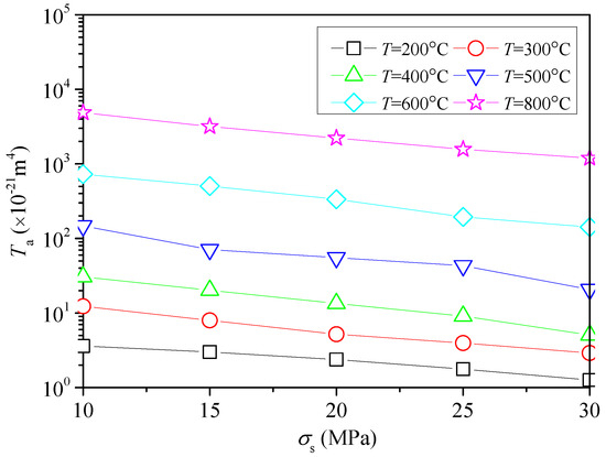 The variations in Ta as a function of pc are displayed in Figure 10. As pc increases, Ta shows a decrease. However, Ta shows an increase with the heating temperature, and the extent of increase gradually increases. For smaller pc values (10, 15 and 20 MPa), Ta is sensitive to pc due to pore/crack closure, especially for samples at higher temperature levels. However, for larger pc values, the reduction rate for Ta gradually decreases, because the induced cracks that are due to thermal damage generally reach their residual crack apertures.