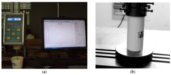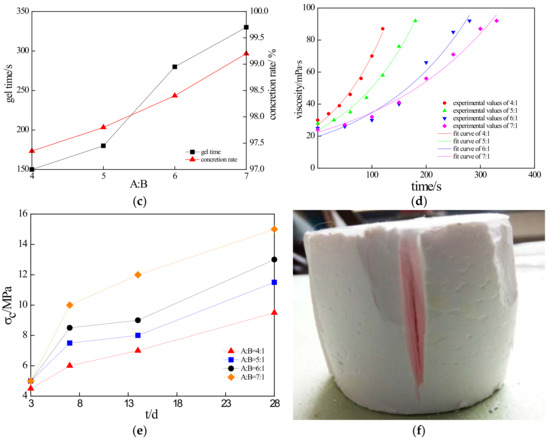 Moreover, the gel time and concretion rate with different volume ratios, viscosity variation with time, UCS variation with different curing time, and the ultimate compressive failure characteristics of the grout gel were determined: the gel time, concretion rate, and viscosity were tested by using a digital viscometer, as shown in Figure 1a. The uniaxial compressive strengths (UCSs) were obtained after the uniaxial compression tests, as displayed in Figure 1b. Figure 1c shows that the gel time and concretion rate both increased as the volume ratio of A and B increased. The values of gel time and concretion rate at A:B of 7 were 330 s and 99.2%, respectively. Similar to the above two parameters, the uniaxial compressive strengths at the same curing time were enhanced with the increasing A:B. In addition, the mechanical strengths also increased with the increase of curing time while keeping A:B unchanged, as shown in Figure 1e. The ultimate compressive failure of the UF-OA grouts, featuring the expansion and vertical splitting fracture of the gel, are as shown in Figure 1f. As shown in Figure 1d, the viscosity of the grouts increased with time but decreased with the increase in A:B. These findings indicated that the UF-OA grouts with an A:B of 7 would have better mechanical characteristics and flow properties than those with other volume ratios. Therefore, UF-OA grouts with a volume ratio of 7 were chosen in this study.
