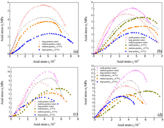 To study the differences in mechanical behaviors among the multiple grouted specimens of different grain size and initial water conditions at 3, 7, 14 and 28 days of curing, different axial stress–strain curves of grouted sand specimens after the uniaxial compression tests are shown in Figure 3. Because the grouts in small-grain sand could not be sufficiently hardened in a short time, no corresponding effective experimental results were obtained on the small-grain grouted specimens after 3 days of curing, as shown in Figure 3a. More details are described in the Discussion.