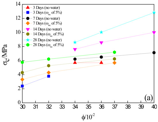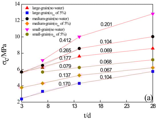 Figure 4 and Figure 5 illustrate the evolution of the different mechanical parameters (namely, uniaxial compressive strength (UCS), elastic modulus (E), and peak axial strain (εc)) of the grouted sand specimens (see Table 3) with curing time (t) and porosity (φ), respectively. Figure 4a revealed that the average values of UCS for all of the grouted specimens in different grain sizes and initial water content increased distinctly with the increase in curing time (from 3 to 28 days). However, the slopes of curves decreased gradually after 14 days of curing (the slopes were quantified by linear fit, as shown in Figure 4a), this observation indicated that the mechanical behaviors for grouted specimens after 14 days of curing appeared to obtain satisfactory improvement. From the curing time of 3 (or 7) to 28 days, the average values of UCS of the grouted specimens not containing initial water increased by approximately 80% in the specimens with small grain size, compared to 76% and 51% with medium and large grain size, respectively, indicating that the curing time had positive effects on improving the mechanical characteristics of the sand after grouting, especially for the sand of smaller grain size. The evolution of UCS over curing time in grouted specimens containing initial water was consistent with that of the specimens without initial water. Additionally, as shown in Figure 5a, for the same curing time, the UCS curves all approximately increased with the increase in the porosity (corresponding to the grain size of sand) (Table 1); in other words, as the sand particle size decreased, the strength of the grouted sand increased, as confirmed by previous research results [22,23]. Zebovitz, Krizek [24] reported that this phenomenon occurs because the number of grain-to-grain contacts per unit volume of sand increases as the gradation of sand becomes finer or as the specific surfaces of the sand become larger; therefore, it is reasonable that the finer sand would exhibit higher strength than the coarser sand. Moreover, because of the presence of initial water in the specimen, the decrease in the UCS of grouted sand was also obviously observed. For example, the UCS of the small-grain grouted specimen without initial water (corresponding to the porosity of 40, see Figure 5) decreased from 12.83 MPa to 7.19 MPa (the UCS value of the small-grain grouted specimen containing initial water corresponding to the porosity of 37, see Figure 5) at the age of 28 days, a reduction of 44% compared to a reduction of 38% in a specimen of medium grain size and a reduction of 33% in a specimen of large grain size.