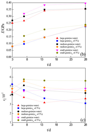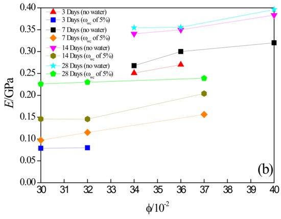 Figure 4b and Figure 5b show the relationships of E–t and E–φ, respectively, where E is calculated as the average slope in the elastic deformation stage of the stress–strain curve. Overall, the average values of E appeared to be increasing with the increase in curing time and grain size (porosity), and this was similar to those of the UCS. For the grouted sand specimens with the same grain size, the average values of E in the specimens not containing the initial water were found to be significantly higher than those with the initial water. For example, they increased by approximately 66%, 55% and 57% after 28 days of curing in the specimens with small, medium, and large grain size, respectively, further demonstrating the adverse impact of initial water contained in sand on the mechanical behaviors of grouted sand.
