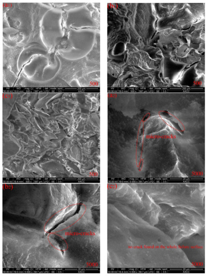 According to Figure 6, which shows the SEM images of sections in grouted specimens (three pieces of specimens chosen with 28 days of curing), the preparation of SEM samples generally includes the following steps: determining the sampling site from the grouted samples, and then obtaining the SEM samples by thin section identification method. The abovementioned macroscopic mechanical results of the grouted sand (the finer the particle size of sand, the greater was the UCS of the grouted sand) can be explained from a microscopic perspective to a certain extent. For example, according to the magnified surfaces in the scale of 1:500 displayed in Figure 6(a1–c1), the finer the particle size of sand, the thicker and denser was the grout filling layer. In more detail, compared to the small-grain specimen magnified at the scale of 1:5000 (Figure 6(c2)), micro-cracks that were not completely filled by UF grouts were found in the large- and medium-grain specimens because of the larger grain size of the sand, as shown in Figure 6(a2,b2). Moreover, referring to Figure 6(c2), finer sand clearly possessed desirable filling performance because the UF grouts filled almost all of the voids and cracks between grains in many section surfaces; this observation was consistent with the observation results of other finer sand specimens after 7 and 14 days of curing. However, at present, it is difficult to draw reliable observations from qualitative SEM images. Therefore, the microstructural characteristics of grouted sand should be investigated and quantified in future research. Moreover, a study on the presence of such micro-cracks occurring in the grouted large-grain and medium-grain sand is needed in the next work because a dissipative phenomenon is associated to them [25,26,27]. Sometimes this dissipative behavior can be as a desired mechanical property, such as in absorbing seismic excitations, provided that it does not lower the resistance too much.