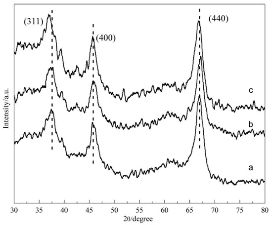Figure 2 shows that the peak shapes of γ-Al2O3, Fe/γ-Al2O3, and Fe-Co/γ-Al2O3 were similar. Figure 2a shows the XRD pattern of the unloaded γ-Al2O3 carrier. This carrier showed evident diffraction peaks at 2θ angles of 66.761°, 45.788°, and 37.603°, which corresponded to (440), (400), and (311) crystal planes of γ-Al2O3, respectively. The diffraction peaks were weak, and the peak width at half height was large; therefore, the crystal particles of the γ-Al2O3 carriers were small. The patterns of the Fe/γ-Al2O3 carrier in Figure 1b and the Fe-Co/γ-Al2O3 carrier in Figure 1c were compared with the diffraction pattern of the γ-Al2O3 carrier. At similar positions, they all had characteristic γ-Al2O3 diffraction peaks; however, no evident characteristic diffraction peaks of iron or cobalt compounds were observed. SEM results were compared with those of spectroscopy. The loaded iron and cobalt elements showed no characteristic peaks on the XRD pattern, most likely because of the following: (1) the total amount of doped iron and cobalt was low; in addition, the content of each element was <7%, which is below the detection limit of the XRD instrument; (2) catalysts are prepared using a homogeneous precipitation method, and iron and cobalt compounds were evenly distributed on the carrier surfaces, thereby forming small particles; (3) the formed iron and cobalt compounds were in an amorphous state. By comparison, the characteristic peaks of γ-Al2O3 shifted and widened, particularly at the (311) plane, although no other characteristic crystal peaks were observed in the diffraction patterns of Fe/γ-Al2O3 or Fe-Co/γ-Al2O3 except those of γ-Al2O3. This finding was most likely caused by iron and cobalt doping, which affects the lattice constant of γ-Al2O3. This process results in the lattice distortion of γ-Al2O3 and the shift in the diffraction peak.