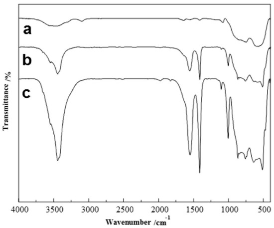 FT-IR spectra of (a) γ-Al2O3; (b) Fe/γ-Al2O3; (c). Fe-Co/γ-Al2O3.