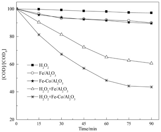 Figure 7 shows that 2.7% CODCr was removed in 90 min when H2O2 as the only oxidant existed in the system. This finding was possible because the oxidation potentials of H2O2 and HO• were 1.776 and 2.85 V, respectively; this result indicated that direct oxidation of H2O2 is significantly lower than that of HO•.