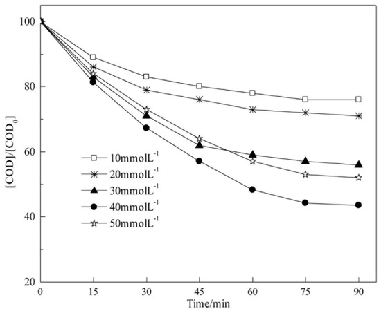 Figure 14 and Table 6 show that CODCr degradation in coalbed methane-produced water is in accordance with pseudo-first-order kinetics in the experimental range of H2O2 concentration (10 mmol L−1 to 50 mmol L−1). The apparent reaction rate constants of CODCr degradation are −0.0034, −0.0041, −0.0076, −0.0111, and −0.0085 min−1 when H2O2 concentrations are 10, 20, 30, 40, and 50 mmol L−1, respectively. The H2O2 concentration is directly related to the HO• yield. As the H2O2 concentration increases, the apparent reaction rate constant increases; however, H2O2 becomes a scavenging agent of HO• when the H2O2 concentration is very high; therefore, the apparent reaction rate constant decreases. The reaction reaches the largest value when the H2O2 concentration is 40 mmol L−1, and the apparent reaction rate constant is −0.0111 min−1.