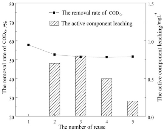 Analysis of the experimental data determined the effects of the catalyst carrier adsorption on CODCr in the effluent from the coagulation-pretreated coalbed methane-produced water in the backflow stage, the direct oxidative degradation with H2O2 for CODCr, and catalytic oxidation degradation of the catalyst/H2O2 system for CODCr. Water quality after coagulation-flocculation is shown in Table 4. The experimental conditions were as follows: 25 °C, pH 5.1 (raw water unadjusted), 368 mg L−1 CODCr; H2O2 concentration was twice the theoretical amount, which was 40 mmol L−1; catalyst concentration of 4 g L−1 was calculated according to the molar ratio of the active component to H2O2 (1:10). The experimental result is shown in Figure 7.