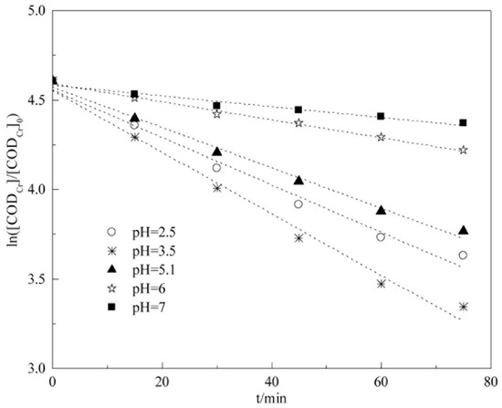 Figure 13 and Table 5 show that CODCr degradation in coalbed methane-produced water in the experimental range of initial pH (2.5 to 7) is in accordance with pseudo-first-order kinetics. The apparent reaction rate constants of CODCr degradation are −0.0133, −0.0172, −0.0113, −0.005, and −0.003 min−1 when initial pH values are 2.5, 3.5, 5.1, 6, and 7, respectively.