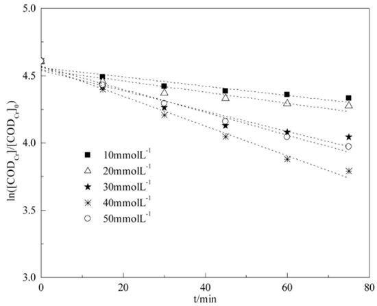 We examine the influence of H2O2 concentration on CODCr degradation kinetics via heterogeneous Fenton reaction in this section. The experimental conditions were as follows: 25 °C, initial pH of 5.1 (raw water), catalyst dosage of 4 g L−1, H2O2 concentrations of 10, 20, 30, 40, and 50 mmol L−1, respectively. The fitting results are shown in Figure 14 and Table 6.