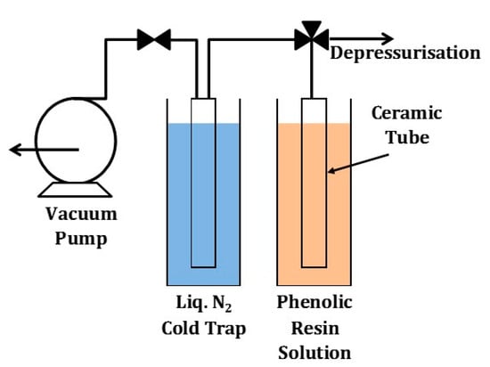 A solution containing a phenolic resin Novolak Resinox IV-1058 was initially mixed with an appropriate amount of hexamine as a curing agent to ensure polycondensation between the phenolic resin and formaldehyde take place [60,61]. In order to obtain a solution with a consistent viscosity for coating substrates, the solution as diluted with methanol at a ratio of 1:99 wt %. The phenolic resin solution was impregnated into the substrate using a vacuum-assisted dip-coating method pioneered by Song and co-workers [42] as schematically shown in Figure 1. In this method, the outer shell of a porous ceramic tube was inserted in a beaker containing a phenolic resin. Then a vacuum (<1 Torr) was applied in the inner shell of the tube, allowing the impregnation of the phenolic resin into the porous substrate. The tube was exposed up to 600 s of vacuum impregnation time followed by a fast withdrawal from the solution in the beaker and rapid depressurisation of the inner shell to atmospheric pressure. Subsequently, the coated ceramic tubes were air dried for 24 h, and vacuum-dried for another 24 h. The final step of this preparation method was the pyrolysis of the coated ceramic tube up to 700 °C under an inert nitrogen atmosphere with a heating and cooling rate of 5 °C min-1 and a dwell time of 1 h. A series of membranes were prepared by using different substrates as listed in Table 2.