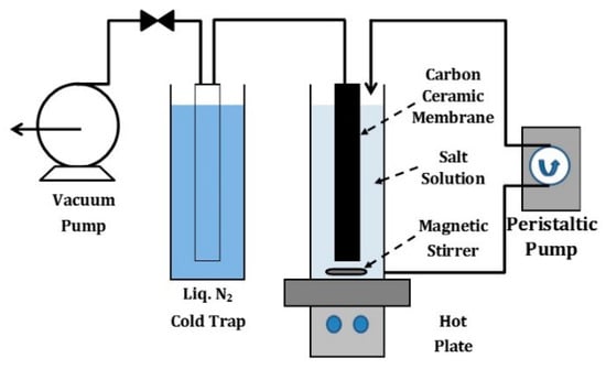 The membranes were tested for desalination using a pervaporation setup, shown schematically in Figure 2. The outer shell of the membrane tube was exposed to a feed salt water solution in a beaker. Feed solutions were prepared by dissolving an appropriate amount of NaCl (Sigma Aldrich, St. Louis, MO, USA) into deionised water, with NaCl concentrations ranging from 0.3 to 3.5 wt %. In this pervaporation set up, the driving force for water permeation through the membrane was provided by a vacuum pump in the inner shell of the tube. The water vapour permeated through the membrane was collected in a cold trap using liquid nitrogen. In order to minimise concentration polarisation, the NaCl was recirculated using a peristaltic pump, whilst the feed salt solution was stirred constantly in the beaker.