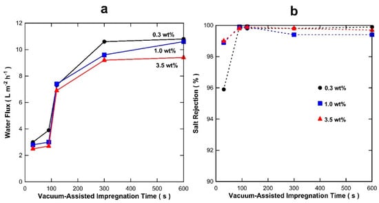 S-C membrane results as a function of the vacuum-assisted impregnation time for (a) water flux (±8%) and (b) salt rejection (±1%) at 20 °C and various NaCl feed concentrations.