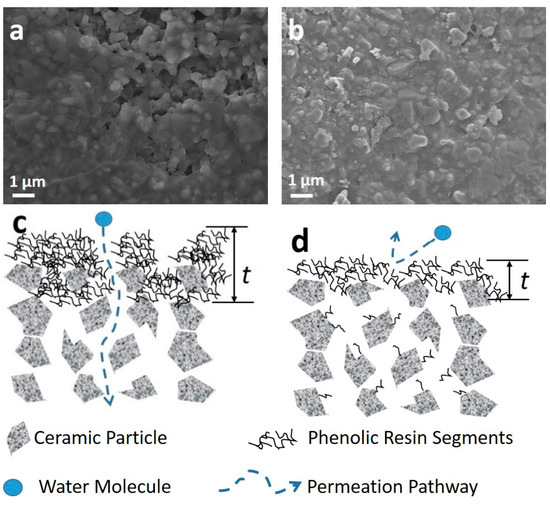Figure 6 depicts a schematic of the S-T membrane impregnation process. As the pores of the support are relatively large, the first impregnation coat still resulted in relatively large pores (Figure 5a). In this process, phenolic resin segments were entrained in the solvent into the S-T substrate. This resulted in the coating of the titania particles, where the inter-particle space could not be filled by the phenolic resin. However, in the second coating step, the inter-particle space was able to be filled. As the concentration of the phenolic resin increased from 1% (Figure 6b), to 5% (Figure 6c) and 10% (Figure 6d), so did the effective thickness (t) of the impregnated membrane. The increase of the effective thickness as a function of the high resin concentration conferred higher resistance for the permeation of water, thus explaining the reduction of water fluxes from 6.0 to 0.8 L m−2 h−1 as the resin concentration increased from 1 to 10 wt %, respectively.