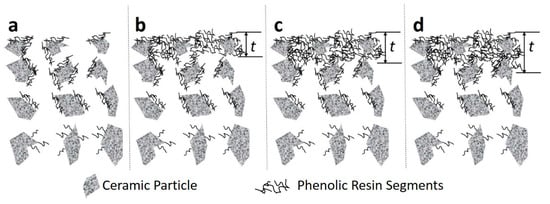 Idealized schematic of the vacuum-assisted phenolic impregnation method for the S-T substrates (a) first impregnation, and second impregnation for phenolic resin concentrations of (b) 1 wt %, (c) 5 wt %, and (d) 10 wt % and the phenolic resin thickness (t).