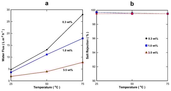 In view of the best performance of the S-T membrane containing two coats of 1 wt % phenolic resin, further tests were carried out with NaCl feed concentrations varying from 0.35 to 3.5 wt % as displayed in Figure 7a. It is notable that the water flux increased from 5 to 28 L m−2 h−1 as temperature increased from 25 to 75 °C for 0.3 wt %. This is attributed to the increase in the driving force. This is a characteristic of membranes with a transport mechanism (J = KΔP°) where water vapour pressure (ΔP°) is the driving force for the water flux (J) through the membrane and K is a permeance coefficient K, which is in turn temperature dependent as reported elsewhere [62]. Therefore, raising the feed solution temperature results in increasing the water vapour pressure in the feed side. As the permeate side water vapour pressure is low due to the vacuum pressure, raising the temperature explains the observed increase in water fluxes. The increase of feed concentration from brackish (0.3 wt %) to sea water (3.5 wt %) led to a significant decrease in water fluxes, particularly as the temperature increased. This cannot be attributed to the changes in vapour pressure, which does not change significantly for the same temperature as a function of the salt concentration [63]. This result could be related to the effect of the hydrophilic titania particles, which could not be fully covered during the two-step vacuum-assisted impregnation applied to the S-T substrates. In Figure 7b, the membrane shows excellent salt rejections of >99.5% in all the testing conditions, demonstrating the feasibility of the two-coating method.