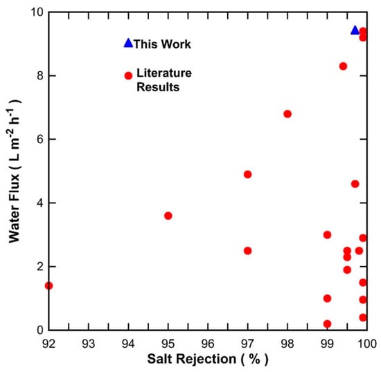 Figure 8 shows a comparison of the water flux versus salt rejection based on the data in Table 1 and the results in the work. It is observed that a large number of membranes are now reaching a high level of water purity as salt rejections are higher than 99%. Further, water fluxes increased as a function of the salt rejection, clearly indicating that membrane preparation processes greatly improved with superior control of pore sizes and reduction of thin film thickness. Compared with the results in the literature, the results in this work are reaching the highest water fluxes and salt rejections. In addition, the carbon/ceramic mixed matrix membrane proved to be very stable as each point in Figure 7 corresponds to one day of full testing. Hence, the membrane was tested for over 200 h at 9 points of temperature and feed salt concentration, and consistently delivered very high salt rejections.
