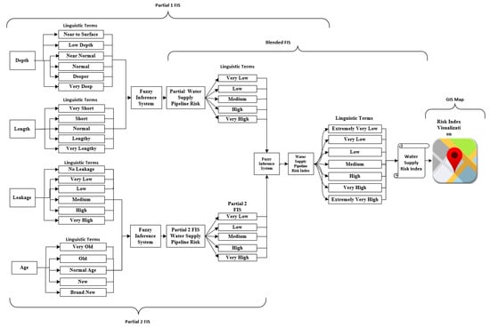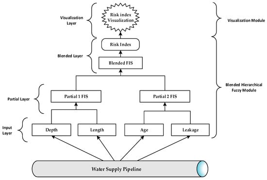 Figure 1 shows the proposed model for water supply pipelines risk index assessment and visualization. The proposed model is mainly comprised of two sub-modules, namely the blended hierarchical fuzzy logic module and the water supply risk index visualization module. The blended hierarchical fuzzy logic module further consists of three layers, namely the input layer, partial layer, and blended layer. The input layer consists of four parameters, namely the leakage, length, depth, and age of water supply pipeline. Further, these parameters are used as inputs to the partial layer; the partial layer consists of two modules, namely partial 1 fuzzy inference system (P1_FIS) and partial 2 fuzzy inference system (P2_FIS). The parameters depth and length are used as inputs to partial 1 FIS and the age and leakage parameters are used as inputs to partial 2 FIS. These two modules return partial risk index values for the water supply pipeline. Further, these partial risk values are provided to blended layers as inputs. The third layer of the proposed blended hierarchical fuzzy model is the blended layer that consists of a single module named the blended fuzzy inference system (B_FIS). The blended FIS receives the outputs of P1_FIS and P2_FIS as inputs. The B_FIS returns the overall risk index for the water supply pipeline. The conventional FIS for four input parameters is given in Figure 2.