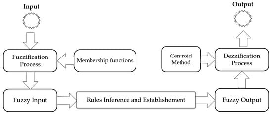 In 1965, Zadeh introduced the idea of fuzzy set theory; this theory now has many applications in different fields, such as engineering sciences, medical sciences, and computer sciences [38]. In this study, we used a Mamdani fuzzy inference system (FIS) in each module of the proposed blended hierarchical fuzzy logic model. The main advantage of Mamdani FIS is simplicity. The rule designing of Mamdani FIS is more simple and efficient compared to the Takagi-Sugeno-Kang fuzzy inference system. The main components of Mamdani FIS are the fuzzifier, knowledge base, inference engine, and defuzzifier. The fuzzifier uses membership functions (MFs) to generate fuzzy values from input values. Then the rules are evaluated in the knowledge base and the maximum aggregation of each consequent membership function values is calculated. The defuzzifier takes fuzzy values as input and generates the crisp values as output [11]. Membership functions play a key role in fuzzy logic construction and operations. Mamdani’s minimum operator method was used for inference and this was defuzzified to a crisp control signal using the center-of-gravity method. The structure diagram of the Mamdani FIS used in this study for each fuzzy inference system is shown in Figure 3.