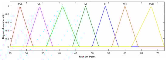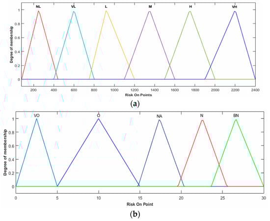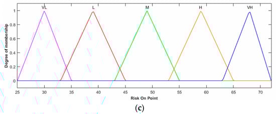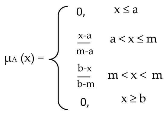 In the literature, there are many types of membership functions (Gaussian, bell-shaped, sigmoid, etc.) that can be used in the Mamdani FIS for fuzzification and defuzzification. The triangle membership functions are more effective and most commonly used in the Mamdani fuzzy inference system [14,39]. In this study, we defined triangular membership functions for each input/output variable in each FIS due to their computational simplicity. As shown in Figure 4, the triangular MF needs only three parameters (a, m, b) to be defined. The parameters a, b, and m respectively represent the lower limit, an upper limit, and a value, where a < m < b. Also, x represents the actual value.