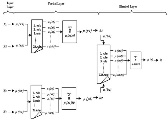 Figure 5 shows the proposed blended hierarchical fuzzy model in detail. The processing of each component of the proposed model is explained in detail. The symbols for input parameters of depth, length, age and length are X1, X2, X3 and X4, respectively. μ(xi) returns fuzzy values where i = 1, 2, 3, 4 for the partial layer. μ(zj) returns implicated fuzzy values where j = 1, 2, 3 … 25. μ(yk) returns the final output of FIS where k = 1, 2 for the partial layer. The outputs of P1_FIS and P2_FIS are represented by b1 and b2. μ(bi) returns fuzzy values where i = 1, 2 in the blended layer. μ(mj) returns implicated fuzzy values where j = 1, 2 … 25. μ(r) is the final risk index value of the blended layer FIS and the proposed model.